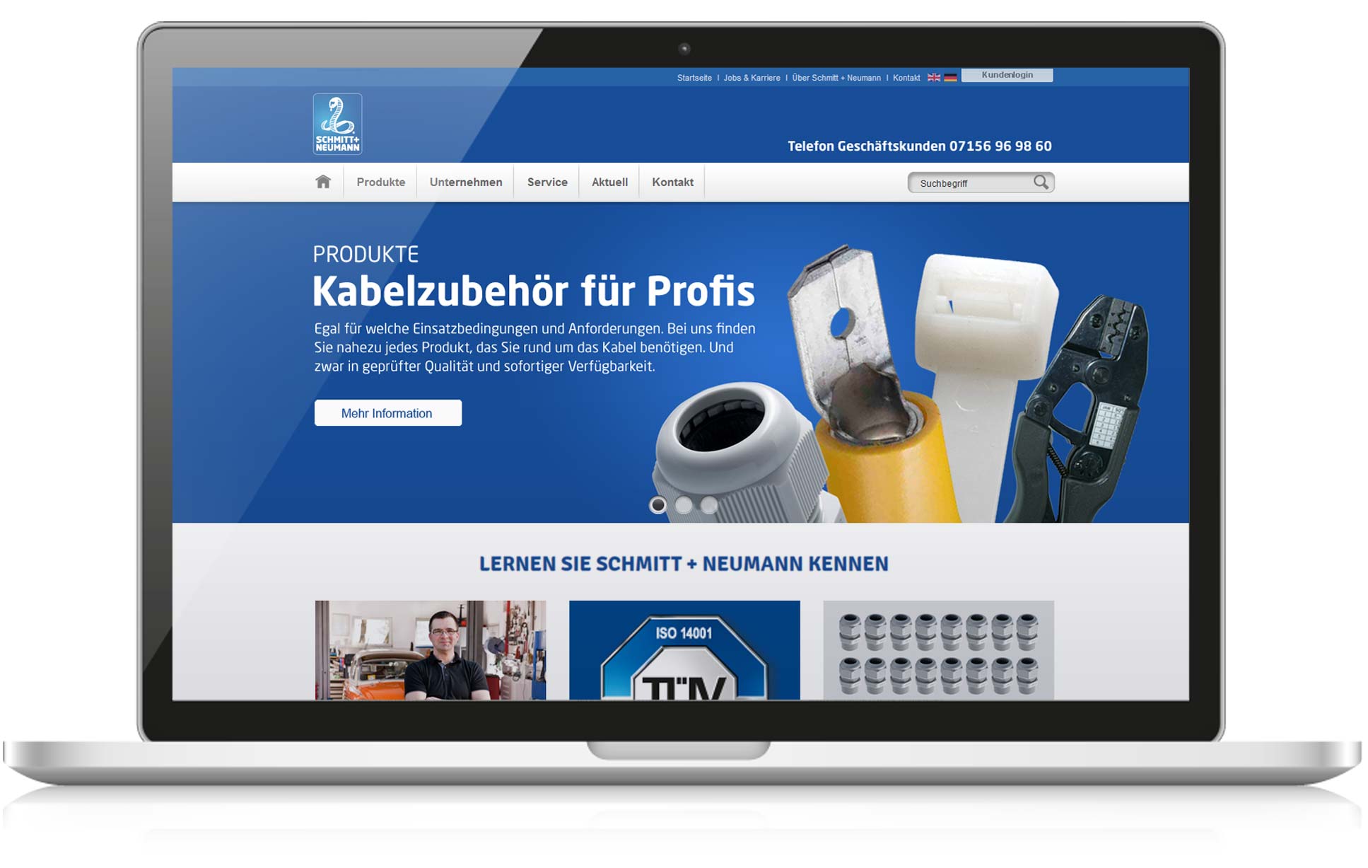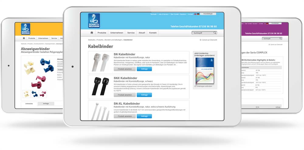 Die Website von Schmitt + Neumann wurde von uns rundum neu aufgesetzt. Im Mittelpunkt stand die Strukturierung und die Menüführung der detailreichen Angebotspalette. Mit zusätzlichem Fokus auf Usability und Reichweite bei Google. Dreh- und Angelpunkt hinter der Homapage ist ein durchdachtes Content Management System (CMS) zur einfachen Verwaltung des Contents und der Produkte.